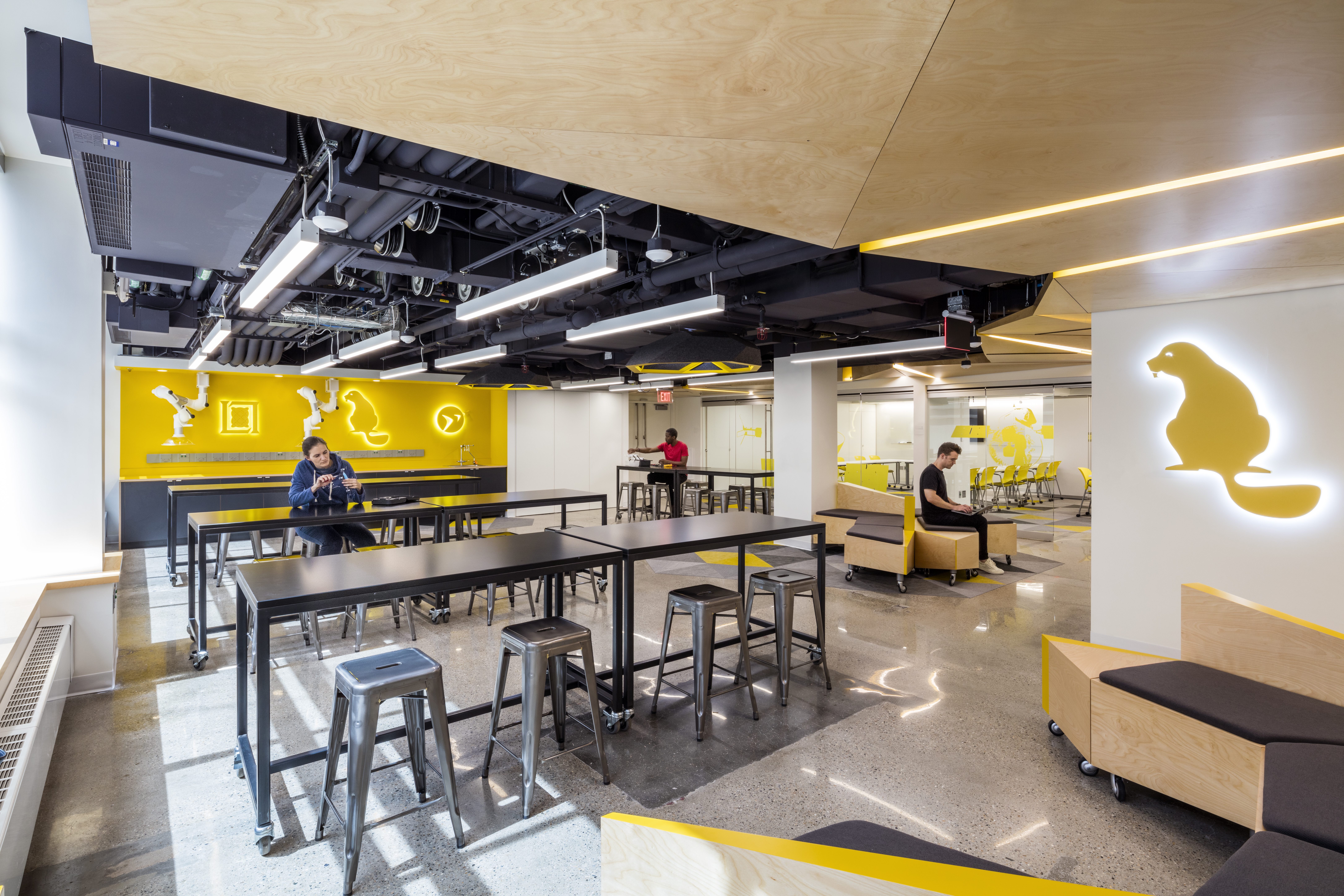 - Open-concept layout with movable tables, chairs, and whiteboards allowing flexible arrangements for projects.